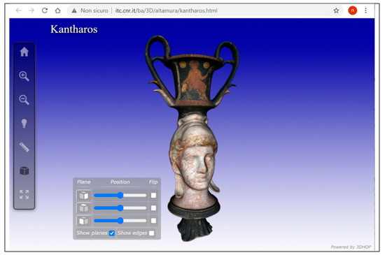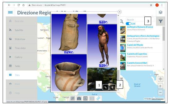 ITC-CNR recently realized a virtual tour for the Museum of Grottaglie (County of Taranto) with views from the ground and from a drone [32]. As for the Regional Museum of Aosta, the virtual tour presents hotspots connecting three-dimensional objects that rotate on a vertical axis (Figure A10) with related information; the objects can be enlarged to full screen with a considerable level of detail.