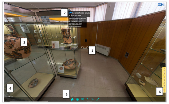Another interesting example is the Regional Archaeological Museum of Aosta [31], not only for the interface of the virtual tour (Figure A9), but, much more, for the presence of connection hotspots to two types of applications that allow differentiated views based on the nature of the object: