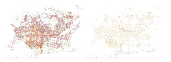 The overlapped view is described together with the topographical base of Barcelona in the background in order to provide some clues from this perspective. Actually, the cross-analysis illustrates once more the importance of the geographical support to determine the form and distribution of the activities over the city. It could be guessed that the more rugged the territory, the less served it is.
