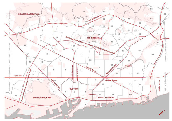 Map guide of the toponymy of Barcelona. Geography and main avenues are highlighted and named in red; the 73 neighborhoods composing the 10 districts are numbered as follows: in Ciutat Vella neighborhood: 1. Raval; 2. Gòtic; 3. Barceloneta; and 4. Sant Pere, Santa Caterina i la Ribera. In Eixample: 5. Fort Pienc; 6. Sagrada Família; 7. Dreta de l’Eixample; 8. Antiga Esquerra de l’Eixample; 9. Nova Esquerra de l’Eixample; and 10. Sant Antoni. In Sants-Montjuïc: 11. Poble Sec; 12. Marina del Prat Vermell; 13. Marina de Port; 14. Font de la Guatlla; 15. Hostafrancs; 16. Bordeta; 17. Sants-Badal; and 18. Sants. In Les Corts: 19. les Corts; 20. Maternitat i Sant Ramon; and 21. Pedralbes. In Sarrià-Sant Gervasi: 22. Vallvidrera, el Tibidabo i les Planes; 23. Sarrià; 24. Tres Torres; 25. Sant Gervasi-Bonanova; 26. Sant Gervasi-Galvany; and 27. Putxet i Farró. In Gràcia: 28. Vallcarca i els Penitents; 29. el Coll; 30. la Salut; 31. Vila de Gràcia; and 32. Camp d’en Grassot i Gràcia Nova. In Horta-Guinardó: 33. Baix Guinardó; 34. Can Baró; 35. Guinardó; 36. Font d’en Fargues; 37. Carmel; 38. Teixonera; 39. Sant Genís dels Agudells; 40. Montbau; 41. Vall d’Hebron; 42. Clota; and 43. Horta. In Nou Barris: 44. Vilapicina i la Torre Llobeta; 45. Porta; 46. Turó de la Peira; 47. Can Peguera; 48. Guineueta; 49. Canyelles; 50. Roquetes; 51. Verdun; 52. Prosperitat; 53. Trinitat Nova; 54. Torre Baró; 55. Ciutat Meridiana; and 56. Vallbona. In Sant Andreu: 57. Trinitat Vella; 58. Baró de Viver; 59. Bon Pastor; 60. Sant Andreu; 61. Sagrera; 62. Congrés i els Indians; and 63. Navas. And finally, in Sant Martí: 64. Camp de l’Arpa del Clot; 65. Clot; 66. Parc i la Llacuna del Poblenou; 67. Vila Olímpica del Poblenou; 68. Poblenou; 69. Diagonal Mar i el Front Marítim del Poblenou; 70. Besòs i Maresme; 71. Provençals del Poblenou; 72. Sant Martí de Provençals; and 73. la Verneda i la Pau.