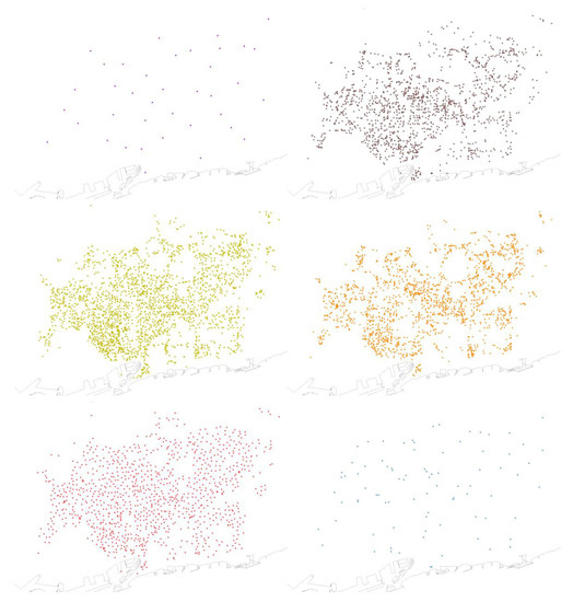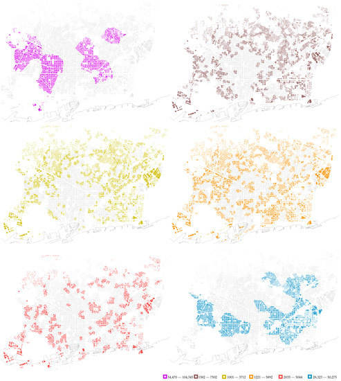 Figure 5 shows the territorialization by layers, representing on the urban fabric the cells that in Figure 4 corresponded to the highest quintile. This image allows the establishment of distinctions between activities that have a higher number of assigned inhabitants and are considered to have more potential to be in critical condition than those that have a lower density of assigned inhabitants: