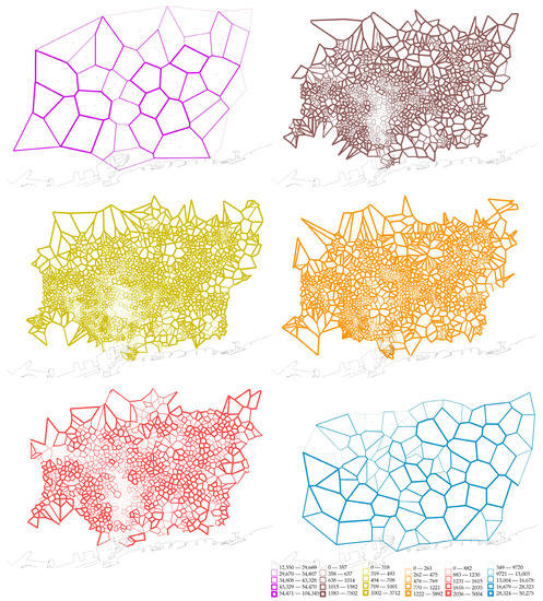 The first series of maps shows the spatial distribution of activities related to population densities. According to the method described in the previous section, a density of inhabitants is assigned to each Voronoi cell to obtain a theoretical model of allocation of the population to each service point. Figure 4 shows the resulting map of division of space into polygons and subsequent allocation of potential users to the tiles. The results for each of the six types of activity are divided into quintiles, and extreme values are taken for a new analysis. This gives two groups of activities designated as “over-assigned” (when the population served is in the top 20%) or “under-assigned” (in the bottom 20%).