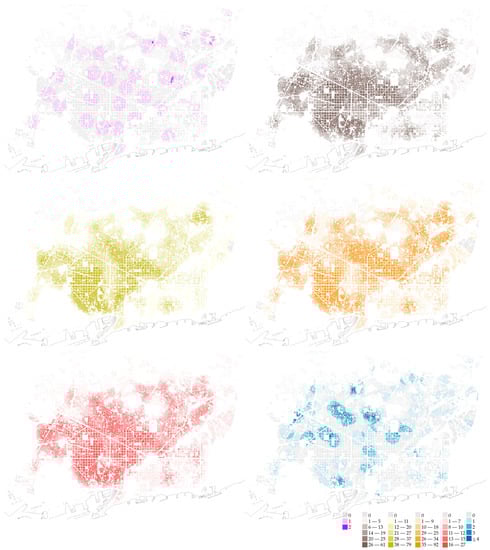 Urban fabric according to the proximity between essential services by category (from left to right and top to bottom: market halls, bakeries, supermarkets, grocery stores, pharmacies and healthcare facilities). Proximity between service units is represented by quintiles (the darker the hatch, the higher the concentration). Table A1 in the Appendix A of this document gives a detailed explanation with precise place names for knowledgeable readers of the city.