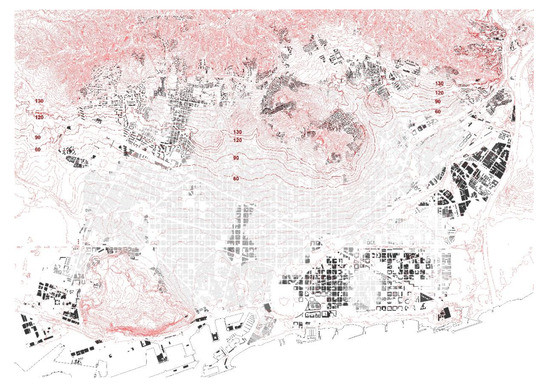 Areas with the fewest number of essential services (excluding facilities). Overlap of the lowest quintile of each of the categories resulting from Figure 6. Three categories are represented here with three different intensities: in black, areas in which the minimum intensity coincides in four of the services; in dark gray, in three of the services; in light gray, in two of them. The topography is superimposed in red and the urban background fabric in light gray. Table A2 in the Appendix A of this document gives a detailed explanation with precise place names for knowledgeable readers of the city.