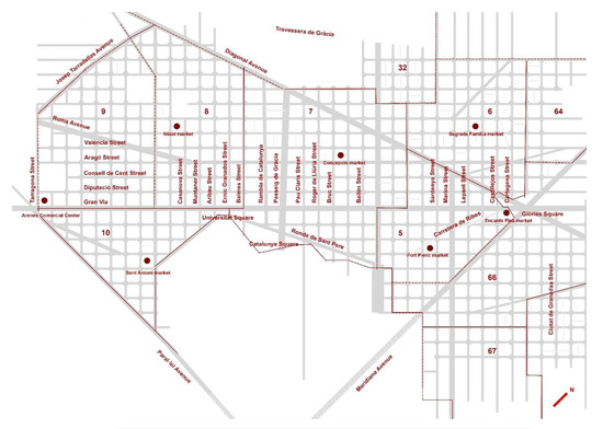 Despite the fact that the Eixample is considered the downtown of Barcelona [38], there are remarkable differences in the distribution of activities and the intensity with which they are carried out in the district. The analysis of essential urban services stresses internal nuances in their distribution and proportion and confirms this heterogeneity. By comparison with the centers of the old villages such as Gràcia, Sant Andreu or Sants, the isotropic nature of Cerdà’s grid gives no clue as to which are the most central spaces within the grid. Nevertheless, the administrative delimitation establishes a total of six neighborhoods inside the district, from southeast to northwest, clockwise: Sant Antoni, Nova Esquerra de l’Eixample, Antiga Esquerra de l’Eixample, Dreta de l’Eixample, Sagrada Família and Fort Pienc (Figure 8 shows these administrative perimeters and some references to the main axes mentioned in following paragraphs).
