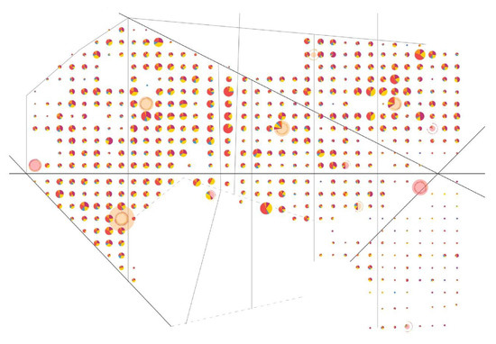 Figure 9. Activities mixture by blocks in the Eixample. Representation of the amount of activity units of each group through pie chart. Considerations: (1) the size of the circle depends on the total count of activities; (2) in markets and shopping centers (as considered by the Economic activities census), the activity count is made in perimeter dots; (3) if a pie chart is overlaid, it only represents activities of the block that are not part of the market or shopping center; and (4) blocks containing only public facilities are not shown. The main city axes overlapped.