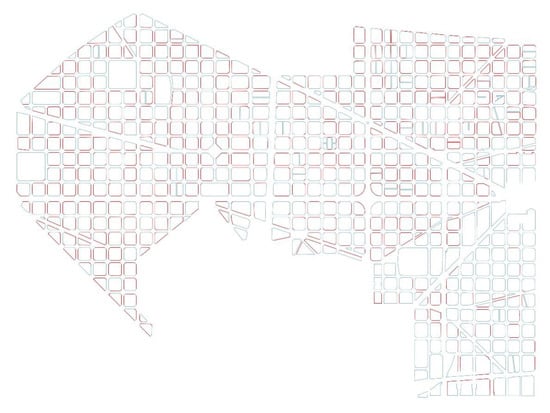 Figure 11. Streets with essential services in the Eixample (red) versus streets with other type of activities or without activities (blue).