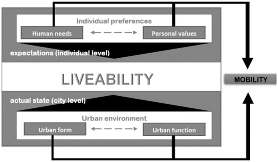 Based on the research of Kovacs-Györi et al. [40] we argue that livability can serve as a useful conceptual and analytical framework to assess and improve the quality of urban life, also considering the personal aspects of the residents by focusing on the personal-environment relationship instead of merely statistical indices with no spatial relevance. Figure 1 shows the key elements and their relationship in livability to clarify what is meant conceptually when using this term throughout the article [40]. The lower part represents the urban environment (i.e., actual state), which consists, on the one hand of the built and natural environment along with the infrastructure, described as urban form. It also includes what this environment can provide for the citizens as urban functions, reflecting how the people use the urban space in the light of the functionality. This component of livability is more tangible, and spatial data for further analysis are available or acquirable, respectively. The upper part of the figure corresponds to the individual preferences (i.e., expectations) in livability and the person–environment relationship, consisting of human needs that the urban functions (or even urban form) need to satisfy and the personal values that define and influence the person’s preferences. Due to the high level of subjectivity, individual preferences bring an inherent limitation to livability assessment, as means or data to extract these preferences are often not available in an intersubjective way. Based on this framework, urban livability describes how well the environment can satisfy citizen needs and expectations, i.e., to what degree the actual state matches the goal state.