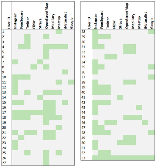 A user’s credibility has traditionally been derived from contribution patterns to individual citizen science projects, mapping platforms, or social media apps—such as Ushahidi [76], Flickr [83], or Twitter [84]—which also led to the development of methods for detecting data vandalism [85]. However, lately, individual users began to become active in multiple crowdsourcing platforms [86], and to use multiple social media services simultaneously. Therefore, we propose to extend the assessment of a user’s credibility and trustworthiness through consideration of activities across multiple platforms. One obvious challenge in that aspect is to identify which users contribute to multiple platforms. This is not a trivial task and largely unaddressed in the GIScience literature. An online survey—conducted by Levente Juhász [87]—was performed to test this hypothesis on a small sample. Participants were asked about their geospatial application usage and requested to share their online activity in 10 geospatial applications. Participants were recruited through university mailing lists, discussion forums and social media channels, and the study mainly focused on Europe and the United States. Figure 2 illustrates the results where 32 out of 53 responding users indicated that they use more than one geolocated social media or crowdsourcing platform. Considering the identification of individuals who are using multiple social media platforms, a common approach is to try to match user names between different platforms. More computationally complex and resource-intensive methods could apply concepts of space-time geography on user contribution patterns to identify contributions to different platforms from the same user [88]. The basic idea behind this would be that space-time prisms, which show an individual’s reachable positions based on a person’s capability constraints (e.g., travel speed) or authority constraints (e.g., rules and regulations), determine whether locations extracted from different data sources could have been visited by the same individual user or not. With millions of users contributing to different platforms, matching up contributions from different platforms and identifying them to be from the same user, if so, will require the use of advanced space-time indexing, data mining approaches, and machine learning techniques [89]. There are also ethical challenges associated with linking individuals and their activity between multiple online platforms, which stem from the right to privacy. Therefore, combining data from multiple platforms should also consider locational privacy. This is best addressed by an approach that combines legal, ethical, technological, and education aspects of the issue [90,91].