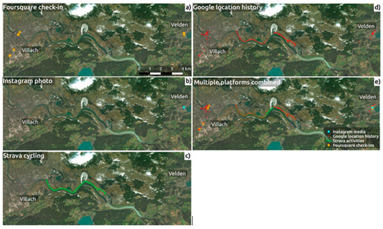 Although the small sample size of the study mentioned above does not allow to draw generalized conclusions about the percentage of social media users who use multiple platforms, we assume that data from multiple data sources (e.g., Twitter and Instagram) can be combined to provide a more complete spatio-temporal representation of an individual’s activities compared to information extracted from a single platform (e.g., Twitter). An illustration of this is given in Figure 3, where maps a–d show locations and activities extracted from Web 2.0 platforms over the course of a day for one user in a region in southern Austria. Figure 3e overlays all geocoded activities of the same individual during the same day and therefore provides a more complete spatial representation of the user’s activities than one single platform. It also provides information about transportation between the cities (i.e., Strava cycling activity). Although this example suggests that the approach leads to increased credibility and completeness, this step of data fusion from different sources needs to be repeated for a larger, more representative, and diverse user base to be able to draw conclusions about its usefulness and applicability for a more general population. Challenges, such as feature matching, which are inherent to data fusion from different sources [92], need to be addressed within this process.