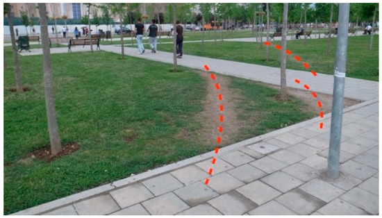 - Generative information. This is information within the city, operating iteratively between distributed agents and/or their environments (actor-networks). This kind of information is capable of generating emergent structures through self-organization, and more particularly, through the dynamic of stigmergy [116]. Examples include built-up environmental patterns (like the modest pathway changes in Figure 4), pop-up structures, neighborhood-scale cooperative projects, and other ‘bottom-up’ iterative changes by residents.