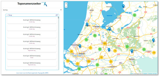 Figure 1 below) is built based on the BRT (Basisregistratie Topografie) dataset maintained by Kadaster, the Dutch Land Registry. This web map application allows for the searching of a geographical name with the goal of identifying where this particular name appears around the Netherlands. The zoom feature on a small scale allows for frequency clusters of the search name to be seen and, on a large scale, the point-based location of the name represented by a pin as you can see represented in the figure below. On the backend of this application, SPARQL and ElasticSearch are being deployed to query the data based on the search term input. As such, this application is loosely designated as having the querying feature, but it should be noted that the user themselves are not able to actively engage in querying the data in the traditional sense.