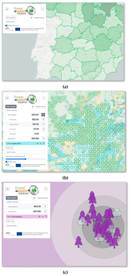 Figure 2). At the smallest scale, a polygon layer is available in which each province in Spain is represented, and hovering over each provides the user with a pop-up containing the metadata and aggregated data pertaining to the number and type of trees in the inventory. The next and larger scale provides an overview of the land cover and individual plots contained within the dataset. At this level, the filtering and searching features allow for the frequency of different trees within a plot to be referenced, and the geo-analytics feature displays this frequency based on a gradient colour scale in each plot. The last and largest scale shows a point-based representation of each tree in the dataset and provides data for each tree with regards to its height and diameter; further evidence of the geovisualisation features of the application. While the application itself does not allow for querying on the frontend, the application does feature querying abilities in parsing the filtering and searching features dictated by the user. In terms of the useability features of the application, these are limited based on the framework on which this review is based. The tool is available as a library and is platform-independent because it can be redeployed on any operating system.