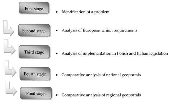 The aim of the study was to compare the degree of advancement in studies on creating and developing geoportals. The subject of the research was the existing Polish National Spatial Data Infrastructure and Italian National Spatial Data Infrastructure. The analysis covered the following systems: Geoportal.gov.pl (Poland) and National Geoportal (Italy). The research methodology is presented in Figure 1. A comparative analysis method was adopted for the study, using a combination of Dukaczewski’s [14] and Dawidowicz’s [1] methods. The research was based on the use of the functional matrix (data and service scope) and compliance with the legal framework derived from the INSPIRE Directive guidelines. According to the five-point Tilgner scale [51], the following system quality classes were adopted for evaluation: