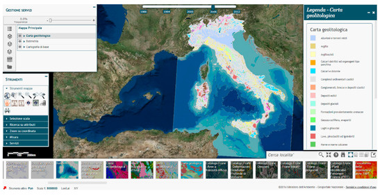 Figure 2, developed in the Repertorio Nazionale dei Dati Territoriali, the portal of the National Catalog for Spatial Data (RNDT), shows a map of Italy with the geological distribution and bathymetry of the surrounding seas. The geoportal provides access to 100 thematic layers. Menus can be moved to different places on the screen, and layers can be set in order of display, and they can even be set to permeability and legend display, but only for one layer. The user can choose from five background maps, and these are orthophotos from 1998, 1994, 2000, 2006 and 2012. Additionally, it is possible to enable 3D view, make measurements using the WMS or ArcGIS service, or save or print the map.
