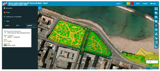 Figure 4 developed in the Territorial Information System (SIT) showing a map of the analyzed part of the city of Bari in terms of public greenery. It was developed using the “Public green” layer with the following attributes: Visual Tree Assessment, Trees–Bushes, Soil, Green Areas, and the base map “Aerial with labels” (the user has 5 base maps to choose from the option without a base map). Additionally, the portal generates a legend in Italian. The portal is functional and is an element of a uniform spatial information system for the municipalities of the metropolitan area of Bari. It is possible to add your own thematic layers and data, as well as access to open-source data, geolocation, distance and surface measurements, and street view data and to generate maps in both png and pdf formats. Construction of such a technologically and functionally advanced system was possible using the information available on the geoportal website from the EU Structural Fund for 2007–2013 and the Metropolitan Cities Operational Programme (2014–2020).