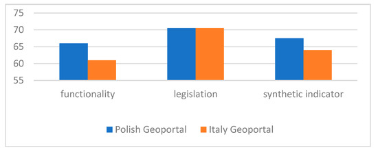 On the basis of percentage analysis of functionality and technical aspects (Table 1 and Table 2), a percentage synthetic index of quality of geoportals of Poland and Italy was developed. It is presented in Figure 6. the percentage state of functionality and verification of compliance with the ubiquitous contextual information model of public access (UPA) defined by the International Organization for Standardization (ISO) 19100. It is at a similar level of 67.5% in Poland and 63% in Italy. Both geoportals according to the Tilgner scale are of good quality. Each European Union country has a national geoportal. They are very important in the spatial information systems of European cities. As shown in the example of Olsztyn and Bari Geoportals, national geoportals are a source of data and metadata and enable analysis, processing and storage of data. However, City Geoportals have greater functionality because they are used for more tasks. Their interfaces are more user-friendly and have more thematic layers because they are created for a smaller area. Data acquisition is also an important element. Downloading in Geoportals of Cities is very convenient because it allows to download maps and import them to GIS software and assuming georefence of data processing and application of different methods of cartographic presentation [59].