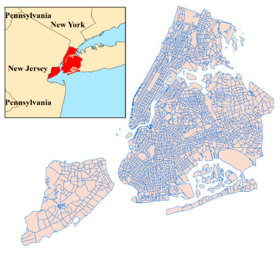 The study area is the New York City, shown in Figure 1, which is the largest taxi market in the North America and is operating the largest street-hailing taxicabs fleet over 13,000. The daily street-hailing taxicab ridership is about 330,000 in 2017; although, it is reduced by almost half compared with its peak records. On the other hand, the app-based taxi services are popular in NYC with more than 5 platforms. The fleet of the largest app-based taxi service provider (i.e., Uber) has outnumbered the street-hailing taxicabs in 2015. The Uber ridership is approaching the daily street-hailing taxicab ridership level in 2017. Moreover, NYC has perfect open datasets including street-hailing taxicab ride records from 2009 to 2016, Uber ride records from April to September, 2014 (ref: https://www1.nyc.gov/site/tlc/about/tlc-trip-record-data.page) and socioeconomic dataset from American Community Survey (ACS), which can support our empirical analyses on treatment effects.