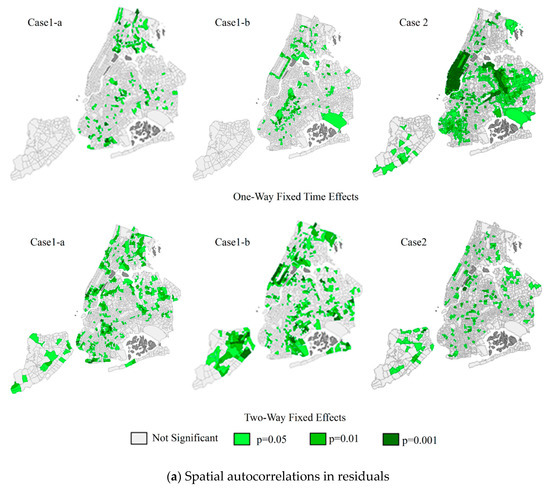 All cases are with typical panel data structures. We also compare our proposed model estimation with traditional fixed effects model for panel data. First, we extract residuals from two fixed effects model including fixed time effects and fixed time and location effects. The local spatial autocorrelation tests by Moran’s I are applied to the average residual in each census tract. Figure 2a presents the census tracts with significant spatial autocorrelations among average residuals. For both fixed effects model and all cases, there are about 400 to 500 census tracts with significant spatial autocorrelations. Especially in fixed time effects model for case 2, it shows much more census tracts with significant spatial autocorrelations. Comparing two fixed effects model, it seems introducing fixed location effects cannot address spatial autocorrelations in case 1, as opposed to conditions in case 2. Figure 2b shows the spatial distribution of average residuals by GPWR estimation. In all three cases, there are almost no significant clusters of similar residuals. The spatial autocorrelations can be well addressed by GWPR. Table 2 summarizes the performance of all estimated models, including log-likelihood, R squared value, AIC, and AICc (i.e., AIC with a correction for finite sample sizes). The GWPR model outperforms traditional fixed effects model, which is with much higher log-likelihood, higher R squared value, and much lower AIC and AICc values. In addition, the introduction of fixed location effects cannot improve the specification by fixed time effects model.