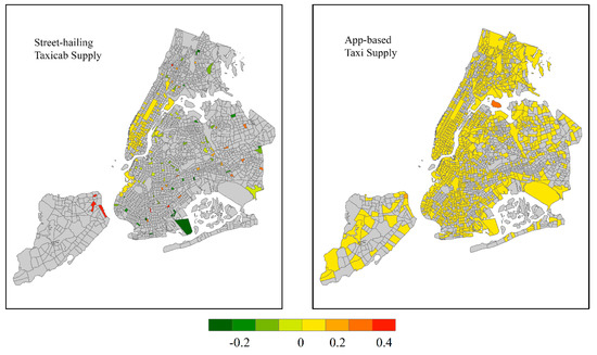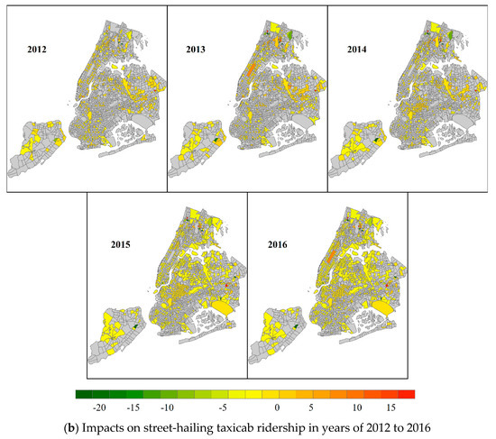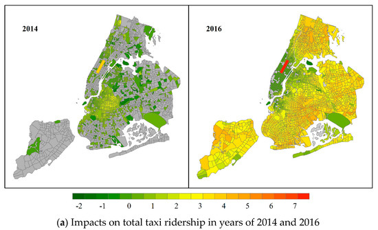 Impacts of presence of app-based taxi services. (Note grey regions mean the corresponding impacts are statistically insignificant).