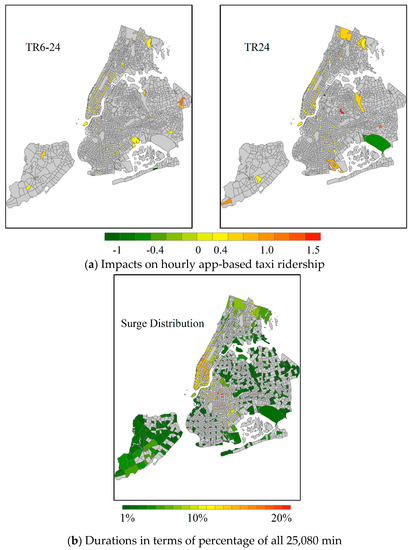 Figure 4a presents the impacts of two treatment effects on hourly app-based ridership. Most areas cannot observe significant impacts, likely due to the frequency of surge pricing. Figure 4b shows how many minutes one census tract is with higher surge multiplier (>1.2). App-based taxicab platforms rarely issue higher surge multiplier and more than half of census tracts are almost without or very low surge multiplier. Even in city core areas always with high travel demand, more than 80% of observation minutes are without higher surge multiplier. Although there are few census tracts with significant treatment effects, we can still explore few interesting findings. First, the high surge multiplier for more than 24 min in one hour will decrease app-based taxi rides by almost 1% at the remote airport. This is likely since rides from the remote airport are always distant trips with a higher base fare and higher multiplier will make trip costs unaffordable. In contrast, a shorter duration of higher surge multiplier will not affect hourly ridership at same location. Another interesting point is that even with longer duration of higher surge multiplier, hourly ridership surprisingly increases by a small rate in city core areas and few remote areas. This is likely because the higher surge multiplier may attract more driver partners and improve request success ratio. Moreover, most short trips with smaller base fares happen in city core areas. Higher surge multiplier will not increase trip cost a lot, and app-based taxi services may be the only option for travel in remote regions thus higher multiplier will not influence hourly rides.