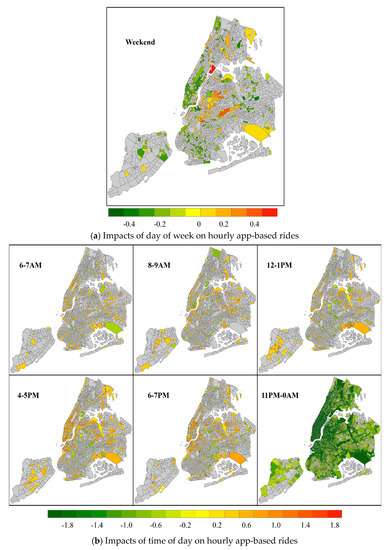 Figure 6a shows the impacts of day of week on hourly app-based rides. In the city core areas full of workplaces, hourly app-based rides are expected to decline by at least 0.2% on weekends. However, potential more travels by flights on weekends contribute to at least 0.2% more app-based taxi rides. Another significant increase in hourly app-based taxi rides on weekends locate outside of city core areas where may be not covered well by other transportation modes. Figure 6b demonstrates the impacts of time of day on hourly app-based rides. First, compared with daytime, hourly app-based taxi rides may decrease by more than 2% during late night in areas generally with high travel demand. Considering airport operation schedules, it does make sense that airports have higher hourly app-based taxi rides during daytime. The city core areas are expected to have 1% more hourly app-based taxi rides between 4 and 5 p.m., as well as evening peak, other than morning peak hours and off-peak hours. The increased app-based taxi rides from 4 p.m. are likely due to street-hailing taxicab shift and temporary shortage of available street-hailing taxicabs. Another interesting point is that more census tracts with decreased app-based rides after early morning and morning peak. Combining with hourly app-based rides in city core areas by time of day, we may confirm the existence of considerable part-time driver partners outside of city core areas. Each day, they share commuting trips with others from houses to core city areas and share back trips to houses after work in core city areas.