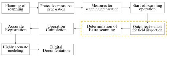 (4) Field inspection. To ensure the data quality and save on labor costs, this step uses a rapid registration for field inspection to determine the need for extra scanning. Even though detailed plans were designed in advance, long hours of scanning and limited working space challenge the data collector’s endurance, energy and concentration. In this case, signal loss, target net movement and resolution variations caused by manual errors are difficult to avoid, which will further lead to data degradation issues. Therefore, field inspection is required in the practical applications.