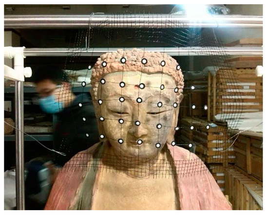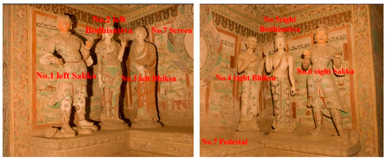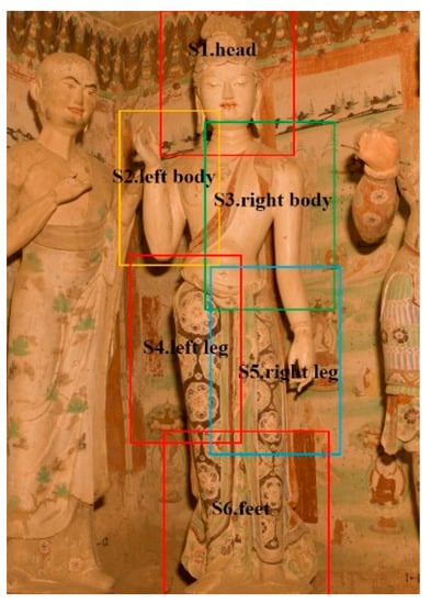 (1) Planning of scanning. In this step, the number of stations and the scanning area of each station were planned. Take the data acquisition in Mogao Grottoes for example, the following steps were employed. (a) Take photos covering the operation area. According to the characteristics of the scene, a scanning order was determined (as Figure 2 shows). (b) For each Buddha, its shape and surroundings were taken into account to determine the number of stations and the scanning area of each station. Generally, for the Buddha with complex shape, more stations were planned to ensure the data quality, and vise verse. Moreover, the space needed for the target net and its fixed support should also be taken into account. (c) To facilitate recording and operation, the planned stations were named after the parts of body (as Figure 3 shows).