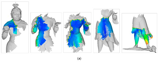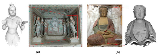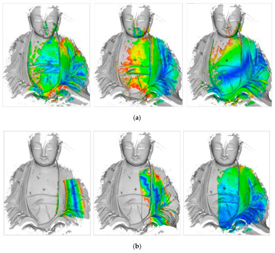 The proposed method was used on scan data from the Mo Kao Grotto at Dunhuang and Wuwei museum in evaluating its performance. All the point clouds were collected using HandySCAN 3D (a hand-held scanner from Creaform, Lévis, Quebec, Canada). Before scanning, a target net was set up to help position the laser beam cross of each moment. Adjacent scans had different overlaps and initial positions. Scans over the General from the Mo Kao Grotto and the Buddha from the Wuwei museum were used for field inspection. We collected the General data in July 2012 and the Buddha data in October 2014. Six scans were set up for each, and 0.67 and 1.44 million points were collected separately. The average point density for the General was about 1.0 mm, and 0.8 mm for the Buddha. The General was 1.6 m in height and 0.9 m in width, while the Buddha in Wuwei museum was 1.4 m in height and 1.2 m in width. The illustration of the scanned point clouds for the General and the Buddha is shown in Figure 5.