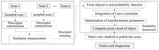 The proposed method mainly includes three parts: the descriptor construction and similarity measurement, the construction of probabilistic framework encoding curve constraints, and the multi-view adjustment method and inspection. The workflow is shown in Figure 6.