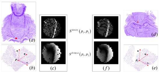 Illustration of Principal direction descriptor, (a,d) show the correspondences from two adjacent point clouds, (b,e) are the constructed local frames, (c,f) are the density image and distance feature image.