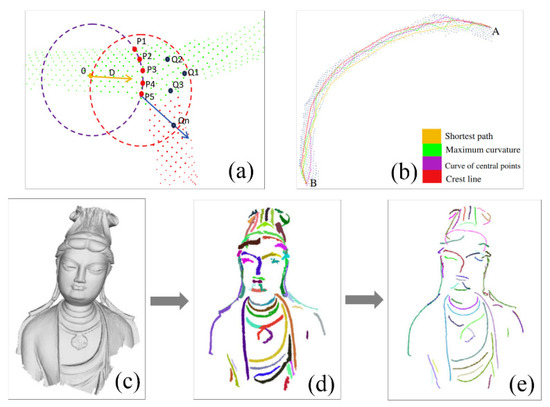 Spatial curves are common and important geometric primitives in free-form artifact objects (e.g., Buddha). To improve robustness, our developed method [23] was used to extract spatial curves. In the algorithm, curvature and several geometric constraints are combined to extract complete and accurate curves. A brief diagram is shown in Figure 8, illustrating how we made our method self-contained.