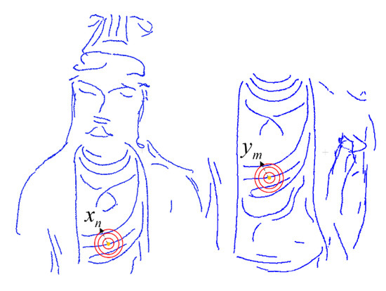 Here, N1, N2, and N3 are the number of curve points from three scales (with different neighborhood radii); xi is one neighborhood curve point of xn; and, yj is its nearest point after the current transformation. We then calculate according to Equation (12). Equation (14) demonstrates that for one true correspondence, their neighborhood curve points should also be similar within three scales (as shown in Figure 9). This correspondence would be given a large matching probability.