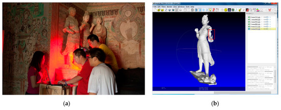 After obtaining a complete point cloud of one artifact object, field inspection was carried out to determine if there are places with missing or quality degraded data. Extra scanning work was executed based on the inspection results. An image of actual fieldwork activity and the software interface for inspection are shown in Figure 10.