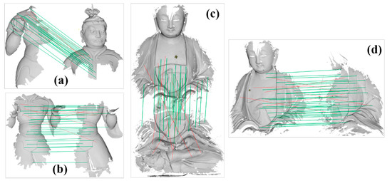 As shown in Figure 11, incorrect ratios of matches from the first iteration were measured at 18.5%, 20%, 21.4%, and 15.8%. For a probabilistic method, this amount of incorrect matches is considered acceptable, which means a good transformation can be obtained. Moreover, these experimental data represent the common appearances of free-form cultural heritage, some even have obvious curved surface (i.e., Figure 11c). The mean incorrect ratios of matches is controlled within 20%, this is because the local frame of the principal direction descriptor is suitable for describing the local geometric properties. These results demonstrate the distinctiveness and descriptiveness of the proposed descriptor and the effectiveness of the matching mechanism. Note that during the iterations, the transformed point clouds gradually shift towards the correct position, and more and more correct correspondences can be matched.