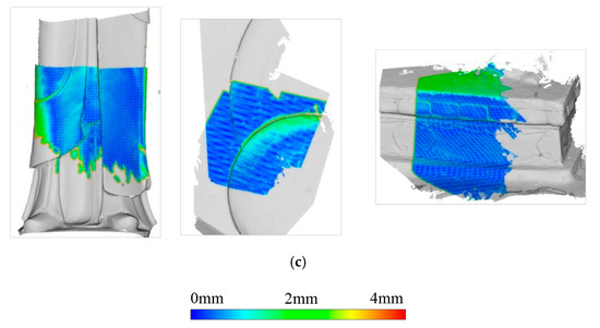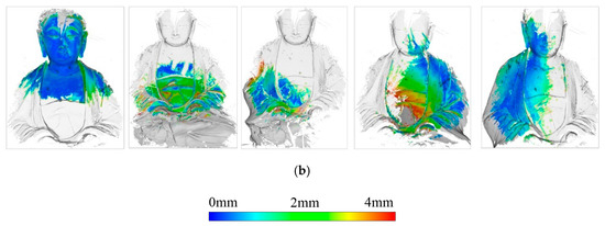 To improve the effectiveness of registration, we used the Geomagic Studio software (Geomagic, Chapelhill, NC, USA) to sample each scan uniformly to a 3.0 mm average point density (about 6000 points). The registration accuracy of the General and the Buddha data is shown in Figure 12. The color is rendered using the distance from one point in the target point cloud to its nearest point of the transformed template point cloud in the overlap areas. To qualitatively demonstrate the registration errors, the results of manual registration were used to evaluate the registration accuracy. Manual registration was performed by manually selecting the corresponding points from the adjacent scans, followed by the ICP refinement. Table 1 provides the evaluation results of the registration performance.