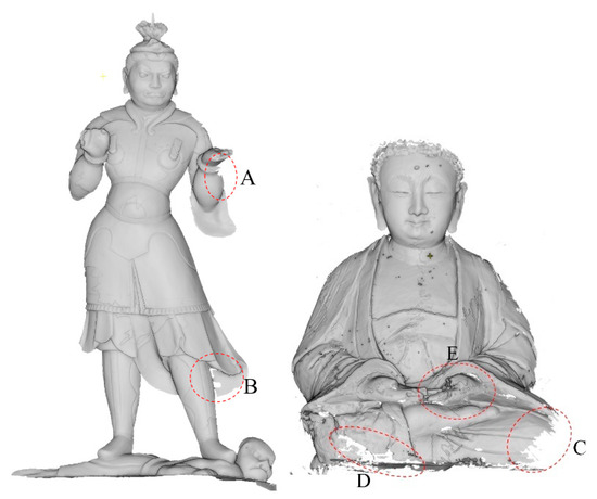To ensure the reliability of the inspection, we performed a multi-view method to further refine the position of each scan. Figure 13 shows the generated images for the General and the Buddha after undergoing the multi-view method. The red circles indicate the problem places identified by inspection. As shown in the figure, many geometric details (e.g., defects) have been preserved well. Through field inspection, we are able to identify the places with missing data (for example, areas A and B in General data, and areas C and D in Buddha data) and those with poor quality (for example, area E in Buddha data). To satisfy the requirements for high accurate heritage documentation, these areas would require extra field scanning.