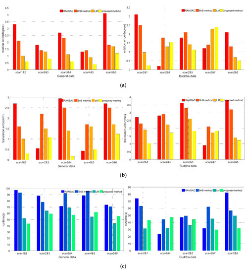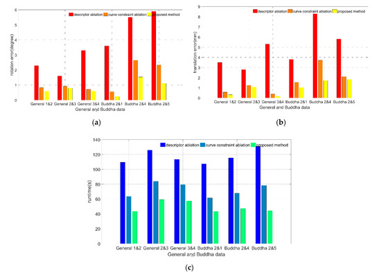 As shown in Figure 16, the results indicate that the descriptor and the curve constraints contribute significantly to the effectiveness and registration accuracy. Specifically, without the descriptor term, the method would result in considerably larger registration errors (almost three times than the proposed method) and would require more time (almost twice than the proposed method). For scans 2&4 and 2&5 of the Buddha data in Figure 16a,b, even the correct convergence cannot be ensured, which could suggest that the descriptor rejects much of the incorrect matches, thereby avoiding local convergence and improving efficiency. On the other hand, without the curve constraints, the registration errors are similar to the proposed method. However, the runtime needed for convergence is significantly increased. This suggests that the curve constraints efficiently limit the solution space, leading to much faster convergence. In conclusion, the above experiments demonstrate that the descriptor and curve constraints improve the accuracy, robustness, and effectiveness of the alignment.
