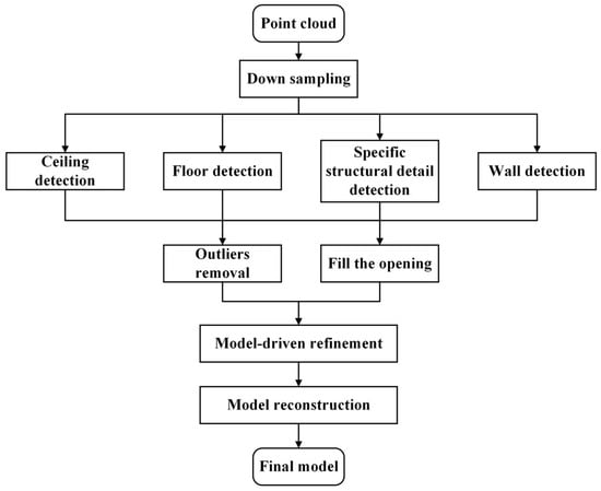 For curved wall structures and detailed structures, the existing algorithms cannot simultaneously handle each interior structure. Therefore, we choose the data-driven strategy that still using the point cloud to represent those structures. After detecting all point clouds of the ceiling, floor and wall, the model-driven post-processing of refinement is implemented to decrease the influence of point cloud quality on the final model. In this section, we briefly introduce the strategy and algorithm used in the approach in Section 2.1. The details about pre-process, structural elements detection, refinement and reconstruction are discussed in Section 2.2, Section 2.3 and Section 2.4.