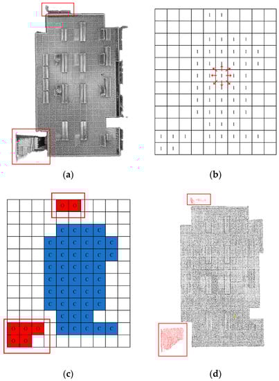 Analysis of detected ceiling surface: (a) raw point cloud dataset for visualization of the outlier, (b) binary map of ceiling part points (“1” for the grid’s value, the red arrow for the process of eight-connected domain algorithm), (c) region map of ceiling part points (“C” for the ceiling grid, “O” for the grid of outliers), (d) detected ceiling segment after outlier removal (red points are the outliers).