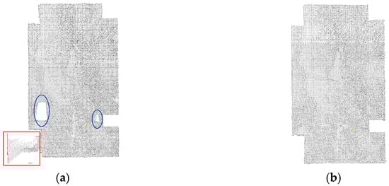 Analysis of the detected floor surface: (a) initial detected floor segment (the points in red rectangle are outliers; the holes in blue ellipses are the occlusions of floor), (b) final floor segment.