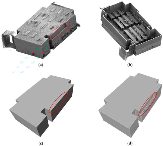 Comparison of the models reconstructed from the backpack laser scanner (BLS) dataset: (a) raw point cloud dataset (the detailed structure points are in the red circle), (b) raw point cloud dataset without ceiling, (c) model generated from Shi’s approach (the detailed structure is ignored in the red circle), (d) model generated from our approach (the detailed structure is reconstructed in the red circle).