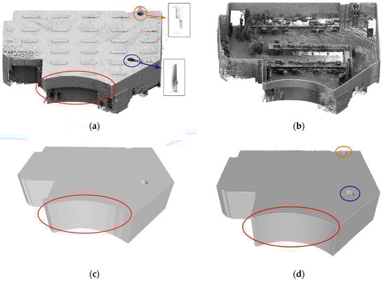 Comparison of the model reconstructed from the handheld laser scanner (HLS) dataset with curved wall structure: (a) raw point cloud dataset (the curved wall structure points are in the red circle, and the pillar points and the specific object points are in the blue circle and orange circle respectively), (b) raw point cloud dataset without ceiling, (c) model generated from Shi’s approach (the curved wall structure is in the red circle), (d) model generated from our approach (the curved wall structure is in the red circle, and the pillar and the specific object are in the blue circle and orange circle respectively).