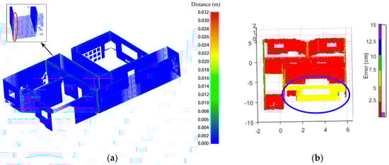 In addition to the visual validation of our approach, we also applied quantitative analysis to synthetic data to evaluate the accuracy of the reconstructed model from our approach. This synthetic model was generated manually in 3D modeling software, and the point cloud dataset is the simulation of virtually scanned by TLS in several positions. Gaussian noise with = 0.1 cm is added to the simulation of point cloud for making the simulation more realistic. The projected perpendicular distance from the point cloud to the reconstructed model is calculated and shown in Figure 11. Figure 11 is also generated from CloudCompare [] software. The average distance is approximately 0.06 cm for the synthetic dataset. Due to the limitation of the Screen Poisson reconstruction algorithm, the wall intersection parts in red circle of Figure 11a cannot achieve the same high accuracy as the main part of the wall, but it still acceptable around 2 to 3 cm. Compared with the evaluation from Shi et al. [] in Figure 11b, the accuracy is significantly improved. The maximum of error is 12.5 to 15 cm, and the error of the wall structure shown in blue circle of Figure 11b is around 5 to 7.5 cm.