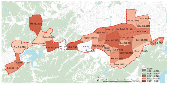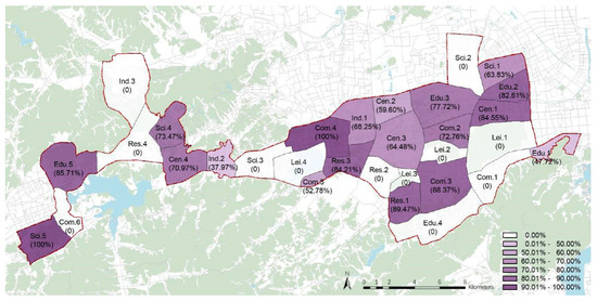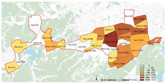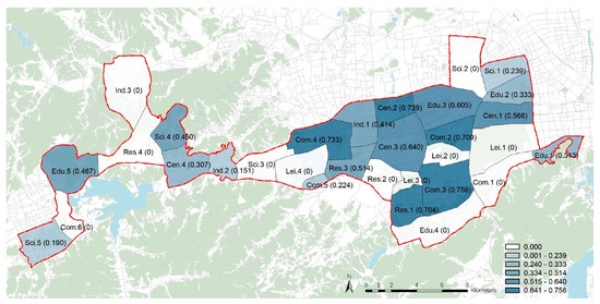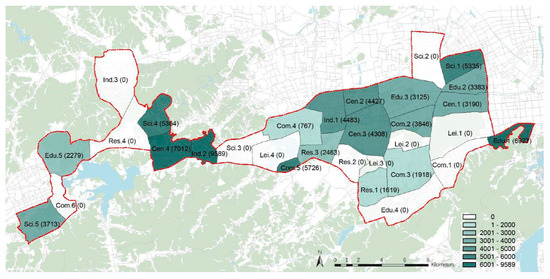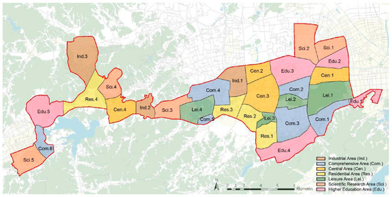 49]. The internal functions of these areas are mixed and all kinds of service facilities facing the leading functions are gathered and shared. The types of these functional areas include a central area, scientific research area, higher education area, industrial area, residential area, comprehensive area and leisure area. (see