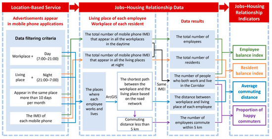 51]. It includes two meanings: first is to identify the geographical location of the mobile device or user; second is to provide location-related information services. In this study, the workplace and living place of employees and residents in the Corridor can be identified through LBS data, which provides a basis for the calculation of occupation-related indicators. In this study, the jobs–housing relationship data include the total number of employees, the total number of residents, the number of people who both work and live in the Corridor, and the commuting distance. The data reflect the population of employees and residents, the distribution and connection of working and living places, etc., and provide a basis for the calculation of jobs–housing relationship indicators. The data, LBS, were procured from Ground Truth, a professional company that provides big data services. The company has partnered with a number of mobile apps and web companies to run advertisements across over 150,000 apps. The location data of mobile phones within a certain range of time and place were observed; then, the workplace and living place of each commuter in the Corridor were inferred. Finally, the data results were obtained, such as the number of employees or residents, commuting distance, for the calculation of the jobs–housing relationship indicators (see