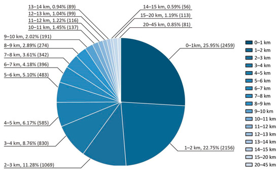 54]. Additionally, the Beike Research Institute, which is a real estate research platform, took the commuting distance within 5 km as the standard for a happy commute, and they drew a “happy commute circle” with a radius of 5 km. It is generally believed that a commuting distance within 5 km indicates that residents have a reasonable and controllable commuting time and various transportation options. In addition to public transportation and private cars, residents can arrive at work by walking, bicycling, or using other non-motorized vehicles, resulting in a happy commuting experience. The higher the proportion of commuters within 5 km, the more people have a pleasant commuting experience, indicating that they work and live nearby. A shorter commute is conducive to achieving a jobs–housing balance and green traveling.