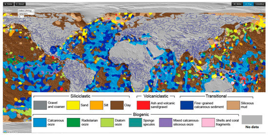 Seabed lithology map by support vector machine (SVM) (screenshot from gplates website (https://portal.gplates.org/cesium/?view=seabed)).