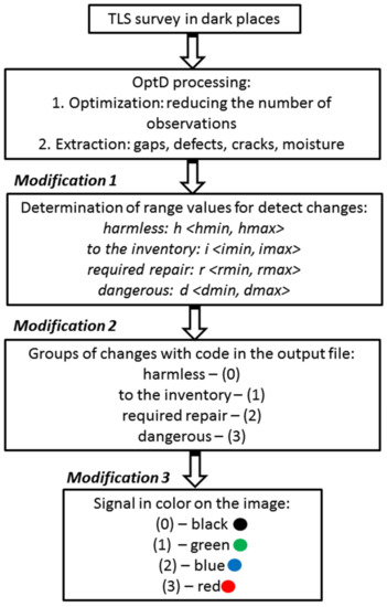 The third modification includes visualization of the types of changes in the wall by adding colors into the point cloud on the basis of the adopted codes. For this paper, the following color scheme was used: 0—black, 1—green, 2—blue, and 3—red. Such an approach makes it possible to quickly assess the condition of the scanned wall and indicate immediately those parts of the wall/building that may be in dangerously poor condition or in need of renovations. The scheme of the workflow with the modified OptD method is shown in Figure 3.