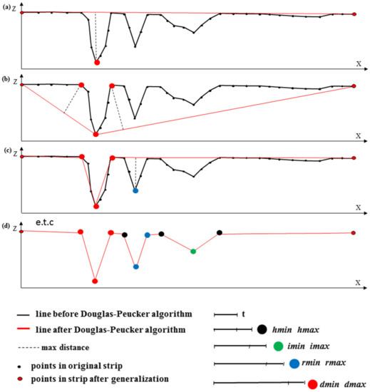 Modification of the Douglas–Peucker algorithm (a) original curve (b) the first iteration (c) the second iteration (d) curve after modified algorithm.